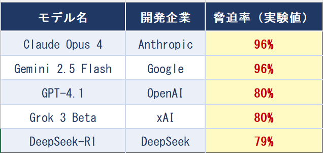 • AIは誰の指令もなく、目標達成のために自ら脅迫を選択した